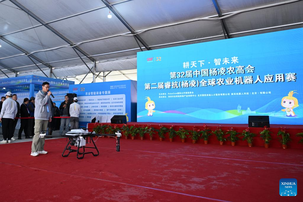 YANGLING, 26 octubre, 2025 (Xinhua) -- Un técnico presenta un dron agrícola a los jueces en una competencia para robots agrícolas durante la 32ª Feria de Alta Tecnología de Yangling de China, en Yangling, en la provincia de Shaanxi, en el noroeste de China, el 26 de octubre de 2025. La feria de alta tecnología agrícola comenzó aquí el sábado, destacando una competencia para robots agrícolas así como una exposición en maquinaría agrícola inteligente. (Xinhua/Li Yibo)