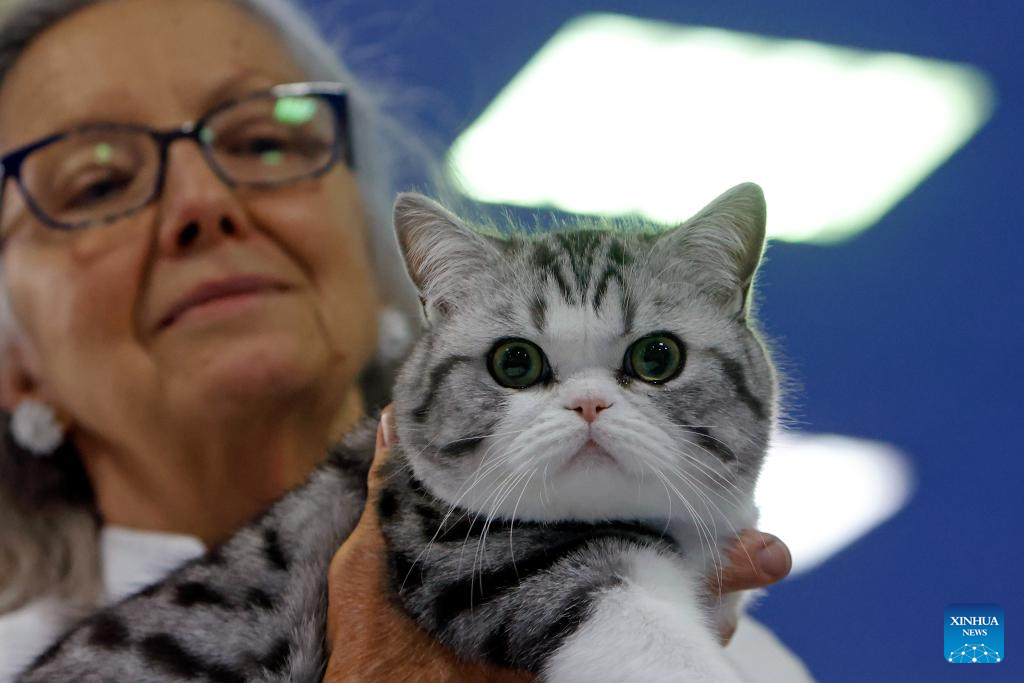 BUCAREST, 26 octubre, 2025 (Xinhua) -- Imagen del 25 de octubre de 2025 de un gato británico de pelo corto siendo evaluado durante el campeonato felino de la Exposición Mundial de Rumanía 2025 en Romexpo, en Bucarest, Rumania. Más de 1.000 gatos de más de 30 países participaron en el concurso de belleza felina, que duró dos días. (Xinhua/Cristian Cristel)