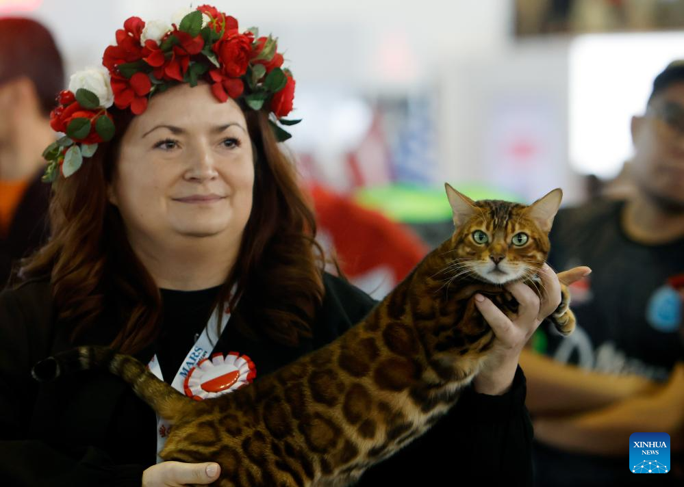 BUCAREST, 26 octubre, 2025 (Xinhua) -- Imagen del 25 de octubre de 2025 de un gato bengala siendo evaluado durante el campeonato felino de la Exposición Mundial de Rumanía 2025 en Romexpo, en Bucarest, Rumania. Más de 1.000 gatos de más de 30 países participaron en el concurso de belleza felina, que duró dos días. (Xinhua/Cristian Cristel)