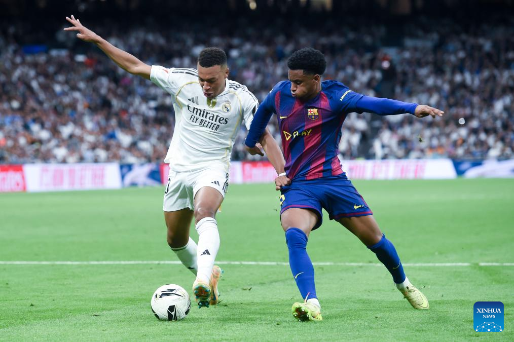 MADRID, 27 octubre, 2025 (Xinhua) -- Imagen del 26 de octubre de 2025 de Kylian Mbappé (i), de Real Madrid, disputando el balón con Alex Balde, de FC Barcelona, durante el partido de fútbol de LaLiga entre Real Madrid y FC Barcelona, en el Estadio Santiago Bernabéu, en Madrid, España. (Xinhua/Gustavo Valiente)