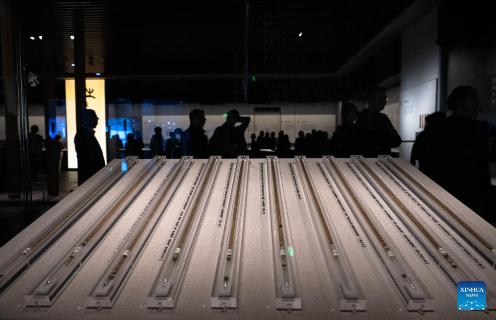 WUHAN, 28 octubre, 2025 (Xinhua) -- Personas visitan la exposición "Antiguas Tiras de Bambú y Madera Chinas", en el Museo Provincial de Hubei, en Wuhan, en la provincia de Hubei, en el centro de China, el 28 de octubre de 2025. La exposición, que cuenta con 230 piezas (conjuntos) de tiras de bambú y madera de múltiples períodos históricos, se inauguró aquí el martes. (Xinhua/Xiao Yijiu)