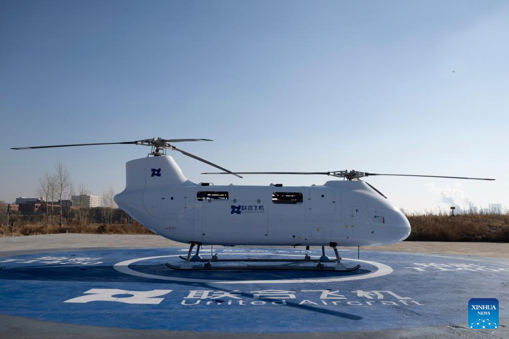 HARBIN, 30 octubre, 2025 (Xinhua) -- Imagen del 30 de octubre de 2025 del helicóptero no tripulado Boying T1400 con rotores en tándem de United Aircraft, en Harbin, en la provincia de Heilongjiang, en el noreste de China. El helicóptero, con un peso máximo de despegue de 1.400 kg, una autonomía de hasta ocho horas, un techo de servicio de 6.500 metros y una velocidad máxima de vuelo horizontal de 180 km por hora, completó con éxito su vuelo inaugural el jueves. (Xinhua/Zhang Tao)