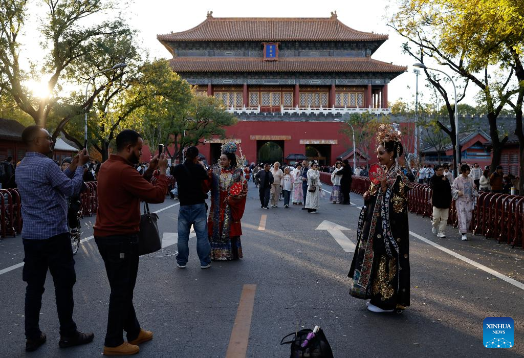 BEIJING, 1 noviembre, 2025 (Xinhua) -- La turista etíope Nuni (i-frente) porta un traje tradicional chino mientras disfruta de su experiencia de sesión fotográfica afuera de la Puerta Donghua, conocida como Puerta de la Gloria del Este del Museo del Palacio, en Beijing, capital de China, el 1 de noviembre de 2025. De enero a septiembre de 2025, Beijing ha recibido aproximadamente 3,88 millones de turistas extranjeros, lo que supone un aumento interanual del 42,9 por ciento, según la Oficina Municipal de Cultura y Turismo de Beijing. (Xinhua/Wang Lili)