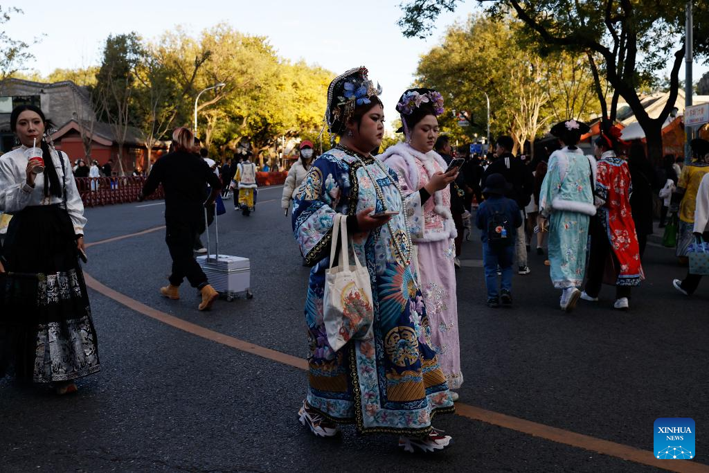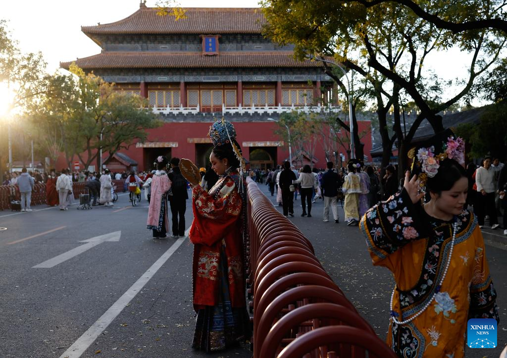 BEIJING, 1 noviembre, 2025 (Xinhua) -- Turistas portan trajes tradicionales chinos mientras caminan frente a la Puerta Donghua, conocida como Puerta de la Gloria del Este, en Beijing, capital de China, el 1 de noviembre de 2025. (Xinhua/Wang Lili)