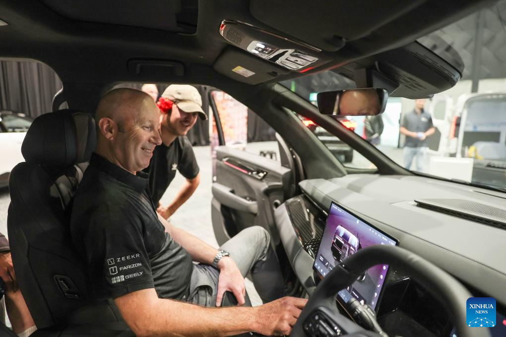 CHRISTCHURCH, 1 noviembre, 2025 (Xinhua) -- Un hombre conoce sobre un vehículo chino BYD en la Take Charge Expo, en Christchurch, Nueva Zelanda, el 1 de noviembre de 2025. La exposición en curso muestra lo último en vehículos eléctricos de batería con las marcas chinas llamando la atención de los compradores internacionales. (Xinhua/Long Lei)