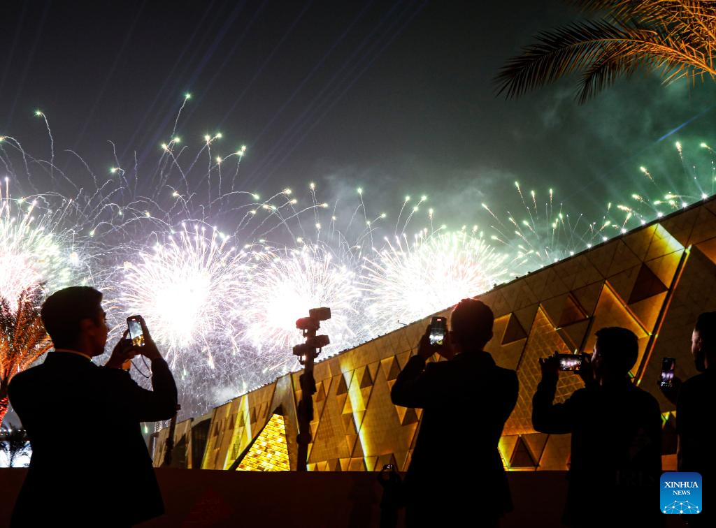 GIZA, 2 noviembre, 2025 (Xinhua) -- Imagen del 1 de noviembre de 2025 de personas capturando imágenes de un espectáculo de fuegos artificiales y luces durante la inauguración del Gran Museo Egipcio (GME), en Giza, Egipto. Luego de dos décadas de construcción, Egipto inauguró el sábado el GME, el museo más grande del mundo dedicado a una sola civilización, con una gran ceremonia realizada cerca de las pirámides y la Esfinge, en un histórico evento cultural para el país reconocido por su rica herencia. (Xinhua/Ahmed Gomaa)