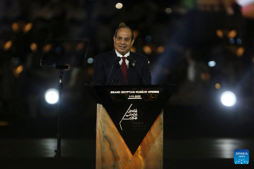 GIZA, 2 noviembre, 2025 (Xinhua) -- Imagen del 1 de noviembre de 2025 del presidente egipcio, Abdel-Fattah al-Sisi, hablando durante la inauguración del Gran Museo Egipcio (GME), en Giza, Egipto. Luego de dos décadas de construcción, Egipto inauguró el sábado el GME, el museo más grande del mundo dedicado a una sola civilización, con una gran ceremonia realizada cerca de las pirámides y la Esfinge, en un histórico evento cultural para el país reconocido por su rica herencia. (Xinhua)