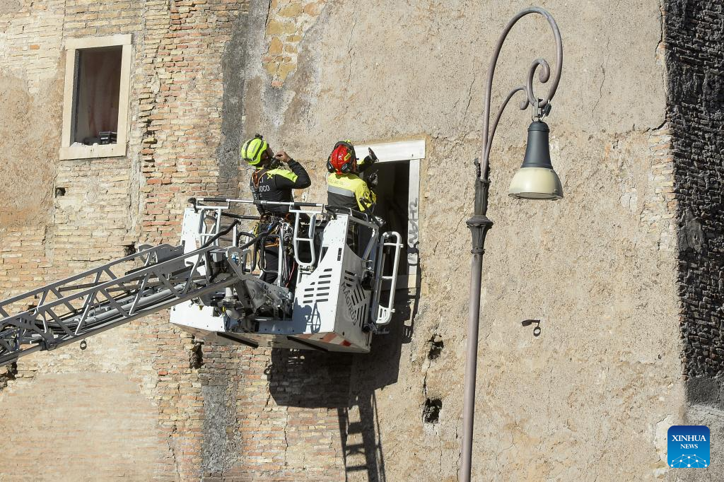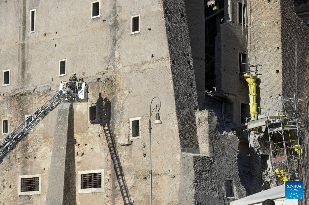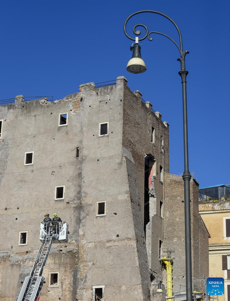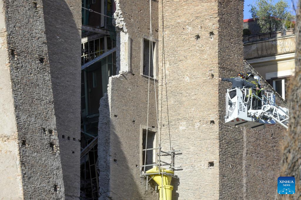 ROMA, 3 noviembre, 2025 (Xinhua) -- Bomberos trabajan en el sitio después de que una sección de la Torre dei Conti, una torre medieval actualmente en restauración, se derrumbara, en el centro de Roma, Italia, el 3 de noviembre de 2025. Una sección de la Torre dei Conti se derrumbó el lunes, hiriendo a cuatro trabajadores de la construcción y desencadenando una operación de rescate de emergencia, informaron medios locales. (Xinhua/Alberto Lingria)