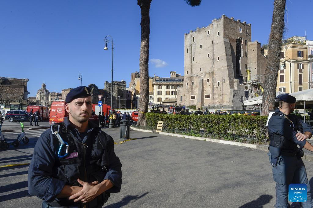 ROMA, 3 noviembre, 2025 (Xinhua) -- Policías y bomberos trabajan en el sitio después de que una sección de la Torre dei Conti, una torre medieval actualmente en restauración, se derrumbara, en el centro de Roma, Italia, el 3 de noviembre de 2025. Una sección de la Torre dei Conti se derrumbó el lunes, hiriendo a cuatro trabajadores de la construcción y desencadenando una operación de rescate de emergencia, informaron medios locales. (Xinhua/Alberto Lingria)