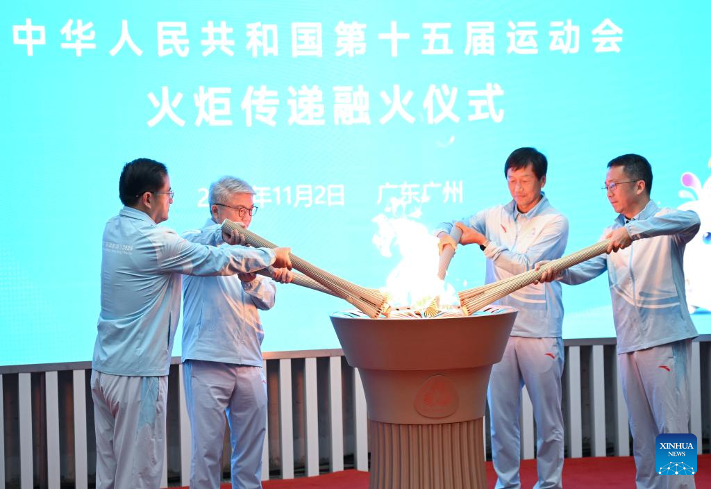 GUANGZHOU, 2 noviembre, 2025 (Xinhua) -- Imagen del 2 de noviembre de 2025 de la ceremonia de relevo de antorcha para los XV Juegos Nacionales de China, en Guangzhou, en la provincia de Guangdong, en el sur de China. (Xinhua/Deng Hua)