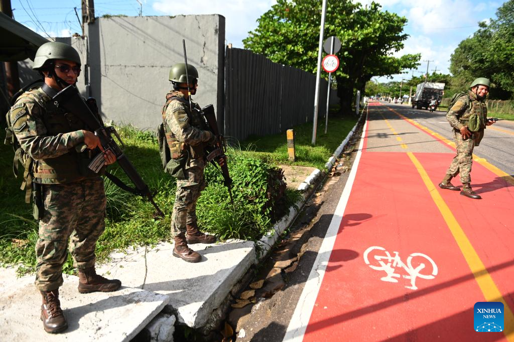 BELEM, 3 noviembre, 2025 (Xinhua) -- Soldados de la Fuerza Aérea patrullan una calle durante una operación de Garantía de Ley y del Orden previo al inicio de la 30ª Conferencia de las Partes (COP30) de la Convención Marco de las Naciones Unidas sobre el Cambio Climático, en Belém, estado de Pará, Brasil, el 3 de noviembre de 2025. El presidente de Brasil, Luiz Inácio Lula da Silva, firmó un decreto, publicado el lunes en el Diario Oficial de la Unión, que autoriza la movilización de las Fuerzas Armadas en operaciones de Garantía de la Ley y del Orden en la ciudad de Belém do Pará hasta el 23 de noviembre próximo. (Xinhua/Lucio Tavora)