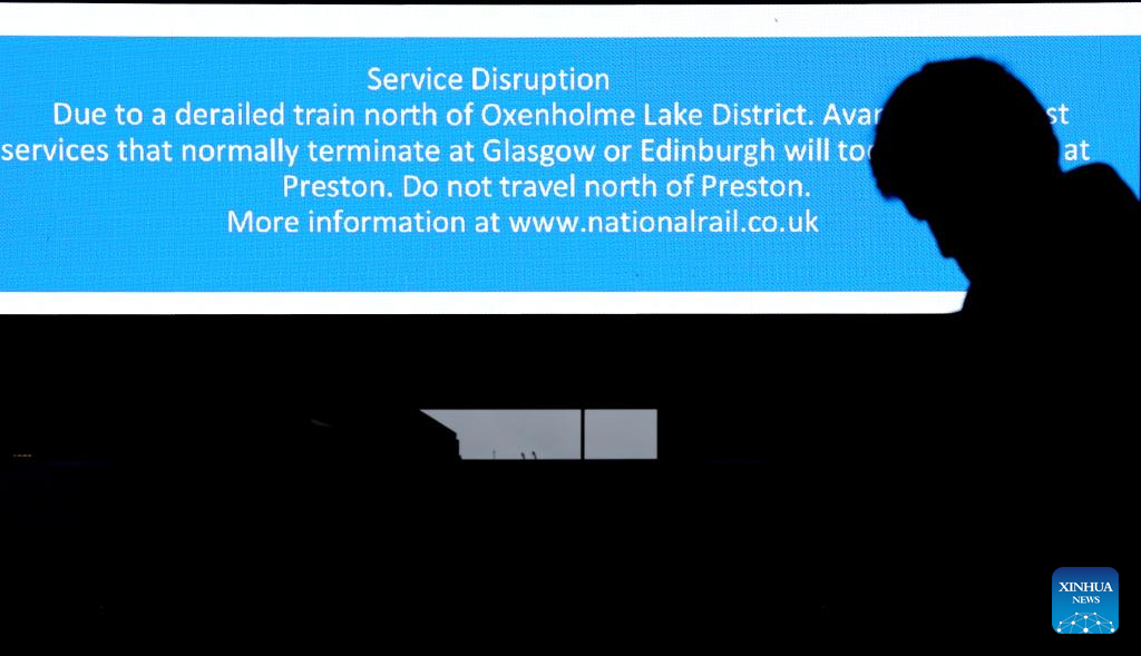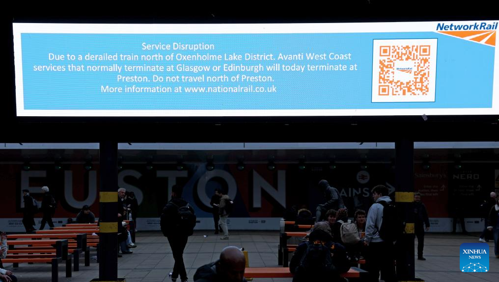 LONDRES, 3 noviembre, 2025 (Xinhua) -- Personas esperan por trenes debajo de una pantalla que muestra información sobre los cambios en los servicios ferroviarios, en la Estación Euston, en Londres, Reino Unido, el 3 de noviembre de 2025. Un tren con 87 pasajeros a bordo se descarriló el lunes en el noroeste de Inglaterra, lo que provocó la interrupción de servicios ferroviarios, informaron medios de comunicación locales. (Xinhua/Li Ying)