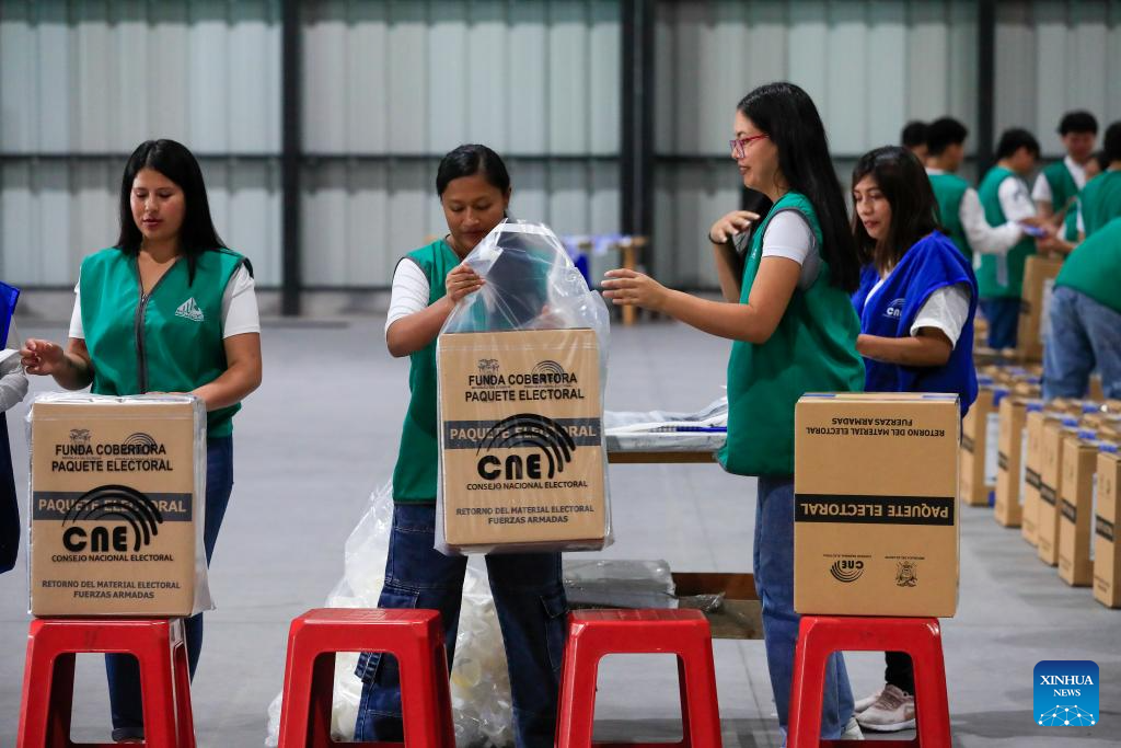 QUITO, 3 noviembre, 2025 (Xinhua) -- Un empleado revisa paquetes electorales almacenados y clasificados por provincia durante la presentación de los avances logísticos para el próximo proceso electoral, en las instalaciones de la empresa integradora Montgar, en la localidad de Pifo, en el extremo nororiental de Quito, Ecuador, el 3 de noviembre de 2025. El Consejo Nacional Electoral de Ecuador avanza en el proceso de armado y distribución de los paquetes electorales que se utilizarán en la consulta popular y el referendo constitucional convocados por el Gobierno para el próximo 16 de noviembre, informó el lunes la presidenta del organismo, Diana Atamaint. (Xinhua/Ricardo Landeta)