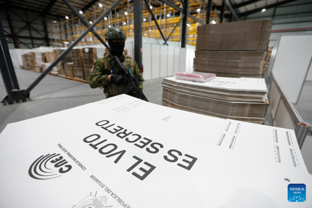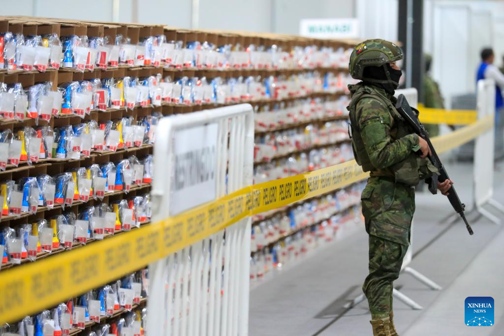 QUITO, 3 noviembre, 2025 (Xinhua) -- Un militar vigila el área de almacenamiento de material electoral durante la presentación de los avances logísticos para el próximo proceso electoral, en las instalaciones de la empresa integradora Montgar, en la localidad de Pifo, en el extremo nororiental de Quito, Ecuador, el 3 de noviembre de 2025. El Consejo Nacional Electoral de Ecuador avanza en el proceso de armado y distribución de los paquetes electorales que se utilizarán en la consulta popular y el referendo constitucional convocados por el Gobierno para el próximo 16 de noviembre, informó el lunes la presidenta del organismo, Diana Atamaint. (Xinhua/Ricardo Landeta)