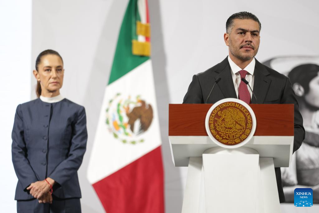 CIUDAD DE MEXICO, 3 noviembre, 2025 (Xinhua) -- El secretario de Seguridad y Protección Ciudadana de México, Omar García Harfuch (d), hablando durante la conferencia de prensa matutina de la presidenta mexicana, Claudia Sheinbaum, en Palacio Nacional, en la Ciudad de México, capital de México, el 3 de noviembre de 2025. Sheinbaum, afirmó el lunes que su Gobierno usará "toda la fuerza del Estado" para enfrentar al crimen organizado, aunque descartó que ello implique una nueva guerra contra el narcotráfico. (Xinhua/Francisco Cañedo)