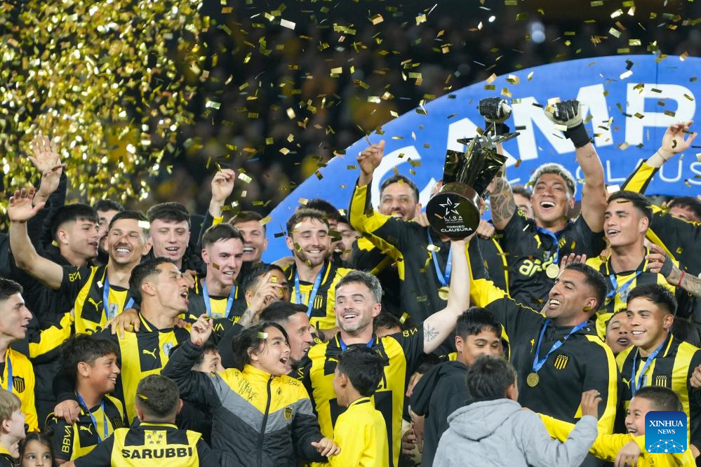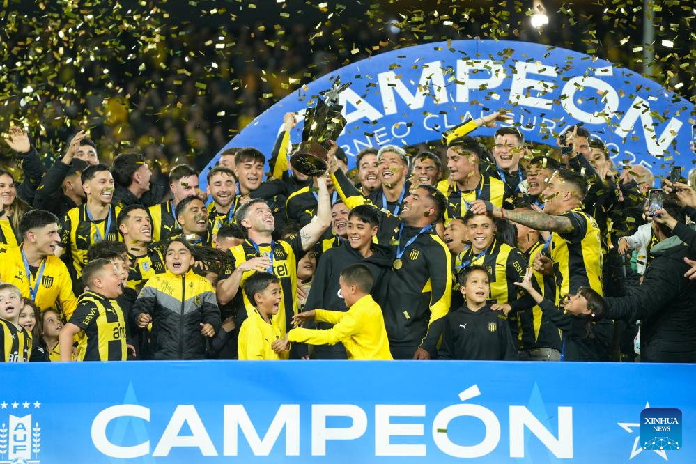 MONTEVIDEO, 3 noviembre, 2025 (Xinhua) -- Imagen del 2 de noviembre de 2025 de jugadores de Peñarol festejando con la copa después de ganar el partido correspondiente al Torneo Clausura del Campeonato Uruguayo de Fútbol ante Defensor Sporting, celebrado en el Estadio Campeón del Siglo, en Montevideo, capital de Uruguay. (Xinhua/Nicolás Celaya)
