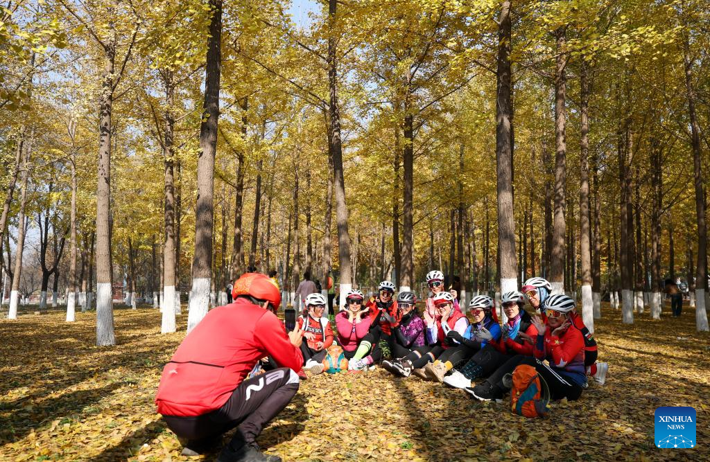 TIANJIN, 4 noviembre, 2025 (Xinhua) -- Ciclistas posan para una fotografía en un bosque de ginkgos en un parque forestal, en Tianjin, en el norte de China, el 4 de noviembre de 2025. (Xinhua/Sun Fanyue)