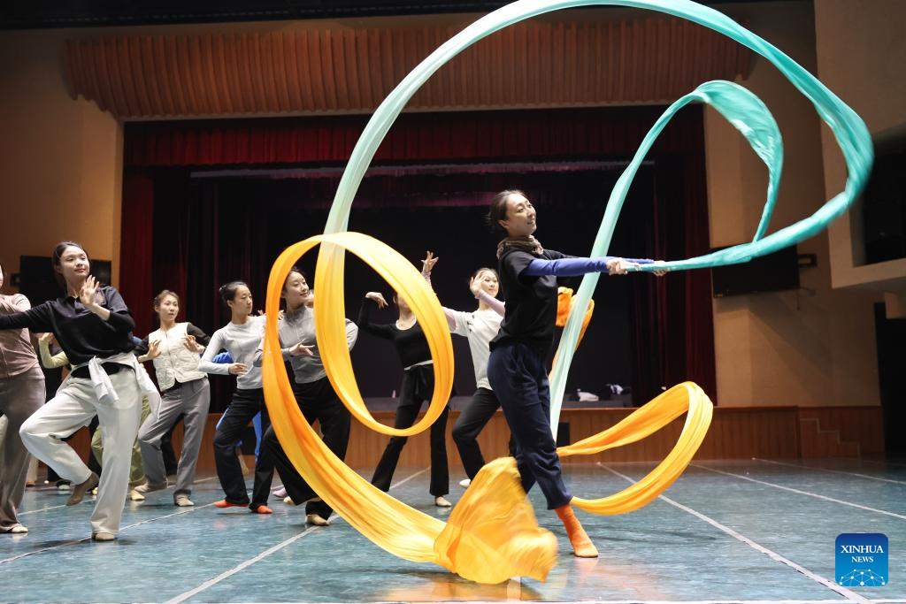 LANZHOU, 4 noviembre, 2025 (Xinhua) -- Imagen del 3 de noviembre de 2025 de bailarinas ensayando el drama de danza "Flores Llueven a lo largo de la Ruta de la Seda", en Lanzhou, en la provincia de Gansu, en el noroeste de China. La danza Dunhuang se refiere a un estilo de danza que tiene como objetivo dar vida a las figuras icónicas representadas en los antiguos murales de las Grutas de Mogao. Inspirándose en temas históricos, artistas contemporáneos han creado obras maestras de música y danza, como el clásico drama de danza "Flores Llueven a lo largo de la Ruta de la Seda", y "Bodhisattva de las Mil Manos". (Xinhua/Chen Bin)