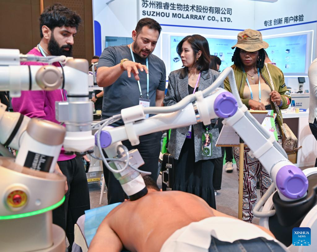 GUANGZHOU, 4 noviembre, 2025 (Xinhua) -- Imagen del 3 de noviembre de 2025 de compradores aprendiendo sobre un robot de fisioterapia durante la 138 edición de la Feria de Importación y Exportación de China, en Guangzhou, en la provincia de Guangdong, en el sur de China. La 138 Feria de Cantón, conocida oficialmente como la Feria de Importación y Exportación de China, concluyó el martes en Guangzhou, la capital de la provincia de Guangdong, en el sur de China, tras haber registrado un número récord de compradores extranjeros. (Xinhua/Xiao Ennan)