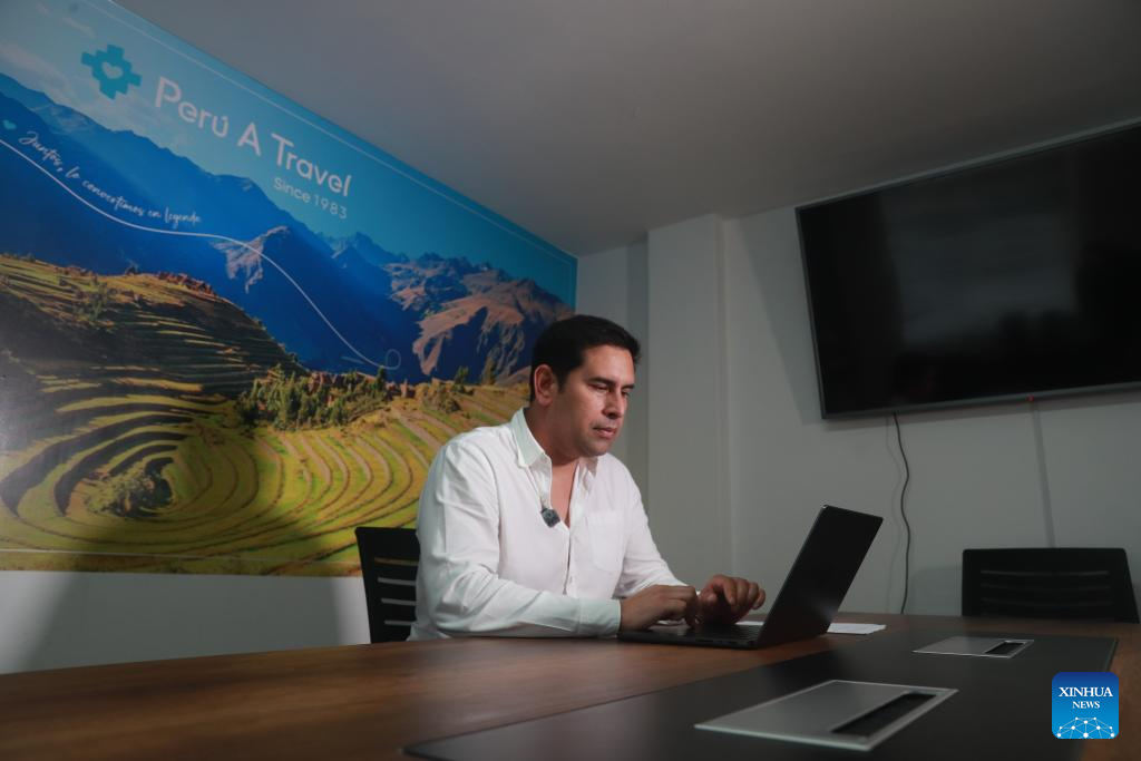 Imagen del 3 de noviembre de 2025 de Publio Santander, gerente de producto y marketing de la empresa turística Perú A Travel, trabajando en su computadora durante una entrevista con la Agencia de Noticias Xinhua, en Lima, Perú. Empresarios peruanos de los sectores turístico y agrícola que participan en la VIII Exposición Internacional de Importaciones de China (CIIE, por sus siglas en inglés) destacaron la relevancia de este evento no solo como una plataforma comercial, sino también como un espacio clave para fortalecer el intercambio cultural entre Perú y China. (Xinhua/Mariana Bazo)