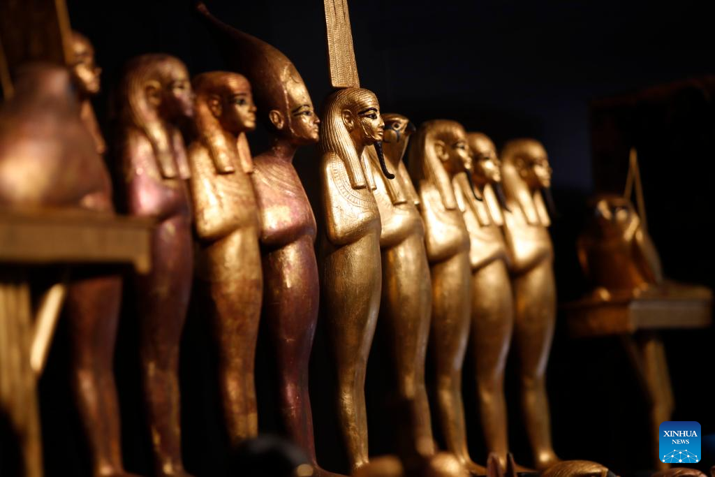 GIZA, 5 noviembre, 2025 (Xinhua) -- Imagen del 4 de noviembre de 2025 de piezas en la sala de exposiciones del rey Tutankamón del Gran Museo Egipcio (GEM, por sus siglas en inglés), en Giza, Egipto. El GEM abrió sus puertas al público el martes, consolidándose como una de las mayores exhibiciones de reliquias antiguas del mundo y una fortaleza de alta tecnología dedicada a la conservación del patrimonio. (Xinhua/Ahmed Gomaa)