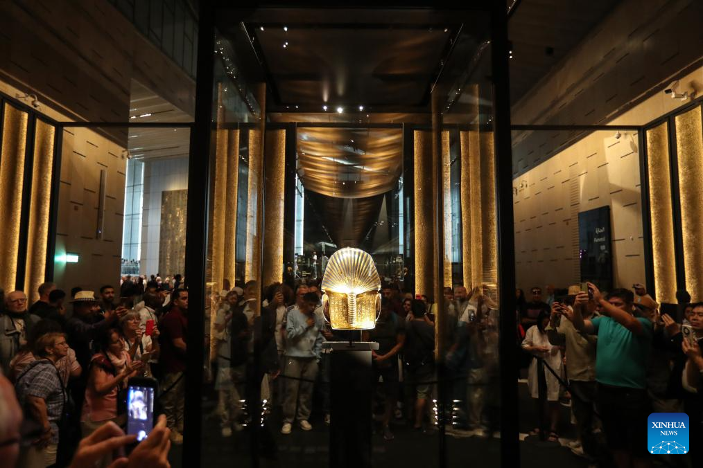 GIZA, 5 noviembre, 2025 (Xinhua) -- Imagen del 4 de noviembre de 2025 de turistas tomando fotografías de la máscara de oro en la sala de exposiciones del rey Tutankamón del Gran Museo Egipcio (GEM, por sus siglas en inglés), en Giza, Egipto. El GEM abrió sus puertas al público el martes, consolidándose como una de las mayores exhibiciones de reliquias antiguas del mundo y una fortaleza de alta tecnología dedicada a la conservación del patrimonio. (Xinhua/Sui Xiankai)