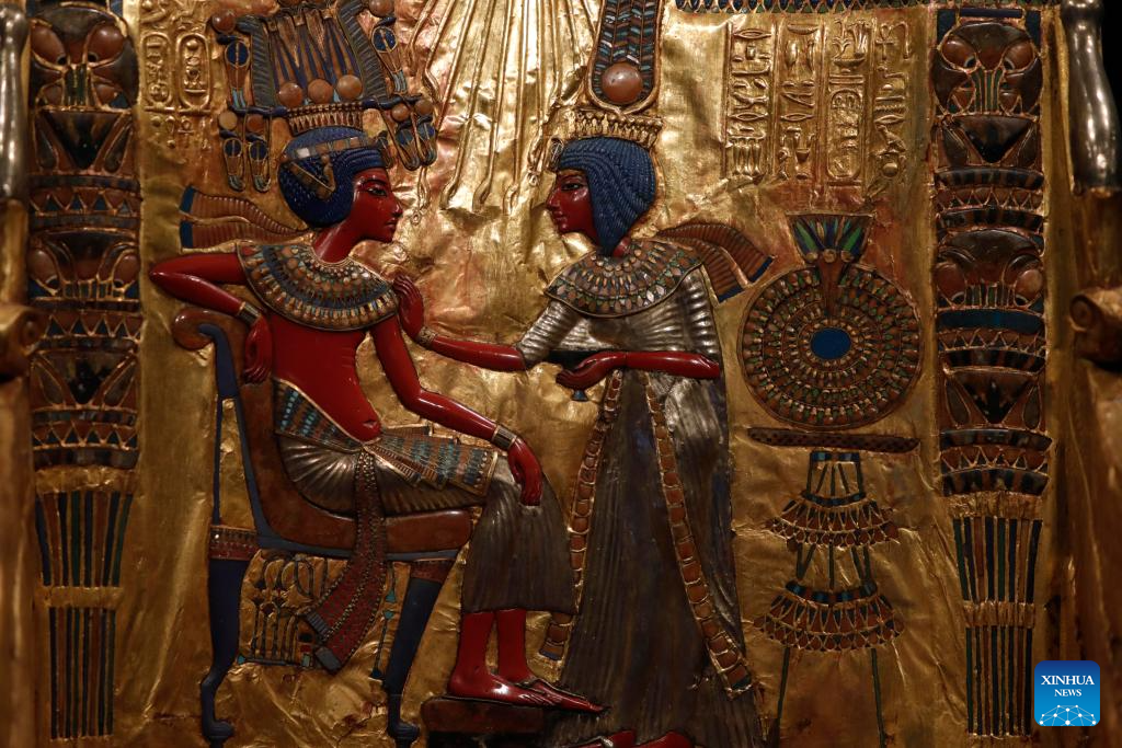 GIZA, 5 noviembre, 2025 (Xinhua) -- Imagen del 4 de noviembre de 2025 del detalle de un trono dorado en la sala de exposiciones del rey Tutankamón del Gran Museo Egipcio (GEM, por sus siglas en inglés), en Giza, Egipto. El GEM abrió sus puertas al público el martes, consolidándose como una de las mayores exhibiciones de reliquias antiguas del mundo y una fortaleza de alta tecnología dedicada a la conservación del patrimonio. (Xinhua/Ahmed Gomaa)