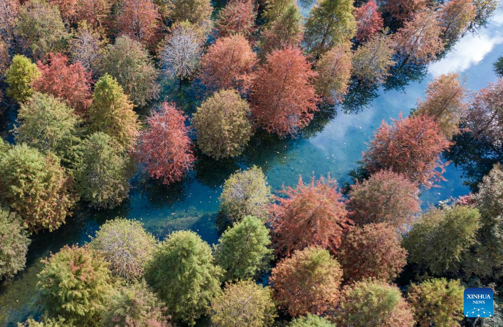 BEIJING, 5 noviembre, 2025 (Xinhua) -- Vista aérea tomada con un dron el 5 de noviembre de 2025 del paisaje otoñal de un parque forestal, en el distrito de Changxing de la ciudad de Huzhou, en la provincia de Zhejiang, en el este de China. (Xinhua/Tan Yunfeng)