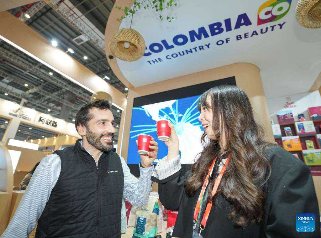 SHANGHAI, 5 noviembre, 2025 (Xinhua) -- Un expositor (i) y una periodista degustan café en el Pabellón de Colombia durante la VIII Exposición Internacional de Importaciones de China (CIIE, por sus siglas en inglés), en Shanghai, en el este de China, el 5 de noviembre de 2025. La VIII CIIE se inauguró aquí el miércoles. Tailandia, Emiratos Arabes Unidos, Nigeria, Georgia, Suecia y Colombia son los países invitados de honor en la CIIE de este año. (Xinhua/Ren Pengfei)