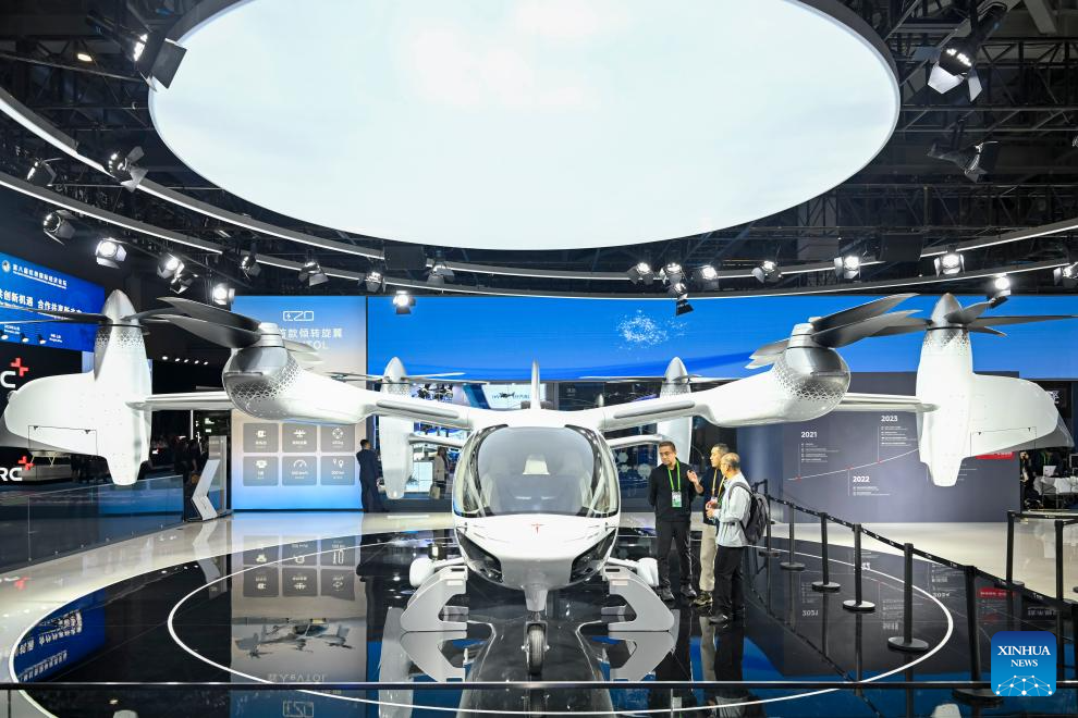 SHANGHAI, 6 noviembre, 2025 (Xinhua) -- Un expositor (c) presenta una aeronave eléctrica de despegue y aterrizaje vertical E20 en el área de exposición Automotriz de la VIII Exposición Internacional de Importaciones de China (CIIE, por sus siglas en inglés), en Shanghai, en el este de China, el 6 de noviembre de 2025. La VIII CIIE, que se inauguró en Shanghai el miércoles y durará hasta el 10 de noviembre, muestra equipos avanzados, tecnologías de vanguardia y productos innovadores en campos como la ciencia y tecnología, la industria manufactura y médica. (Xinhua/Chen Haoming)