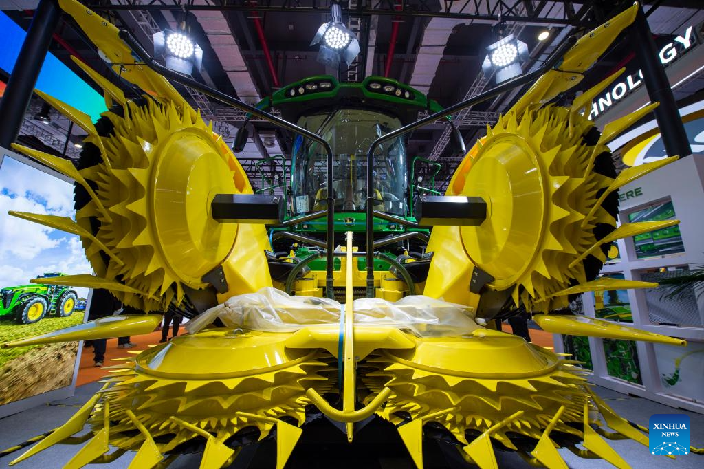SHANGHAI, 6 noviembre, 2025 (Xinhua) -- Una cosechadora autopropulsada es vista en el área de exposición de Industria Inteligente y Tecnología de la Información de la VIII Exposición Internacional de Importaciones de China (CIIE, por sus siglas en inglés), en Shanghai, en el este de China, el 6 de noviembre de 2025. La VIII CIIE, que se inauguró en Shanghai el miércoles y durará hasta el 10 de noviembre, muestra equipos avanzados, tecnologías de vanguardia y productos innovadores en campos como la ciencia y tecnología, la industria manufactura y médica. (Xinhua/Ding He)