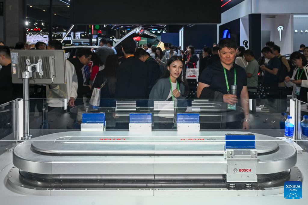 SHANGHAI, 6 noviembre, 2025 (Xinhua) -- Visitantes observan LeTrak, un sistema de transporte por accionamiento magnético de Bosch, en el área de exposición Automotriz de la VIII Exposición Internacional de Importaciones de China (CIIE, por sus siglas en inglés), en Shanghai, en el este de China, el 6 de noviembre de 2025. La VIII CIIE, que se inauguró en Shanghai el miércoles y durará hasta el 10 de noviembre, muestra equipos avanzados, tecnologías de vanguardia y productos innovadores en campos como la ciencia y tecnología, la industria manufactura y médica. (Xinhua/Chen Haoming)