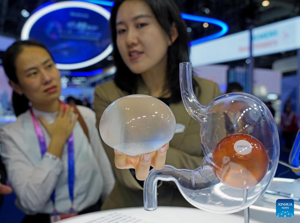 SHANGHAI, 6 noviembre, 2025 (Xinhua) -- Una expositora presenta el sistema de balón intragástrico Orbera365, que es utilizado para ayudar a los pacientes a perder peso, en el área de exposición de Equipo Médico y Productos de Cuidado de la Salud de la VIII Exposición Internacional de Importaciones de China (CIIE, por sus siglas en inglés), en Shanghai, en el este de China, el 6 de noviembre de 2025. La VIII CIIE, que se inauguró en Shanghai el miércoles y durará hasta el 10 de noviembre, muestra equipos avanzados, tecnologías de vanguardia y productos innovadores en campos como la ciencia y tecnología, la industria manufactura y médica. (Xinhua/Liu Ying)