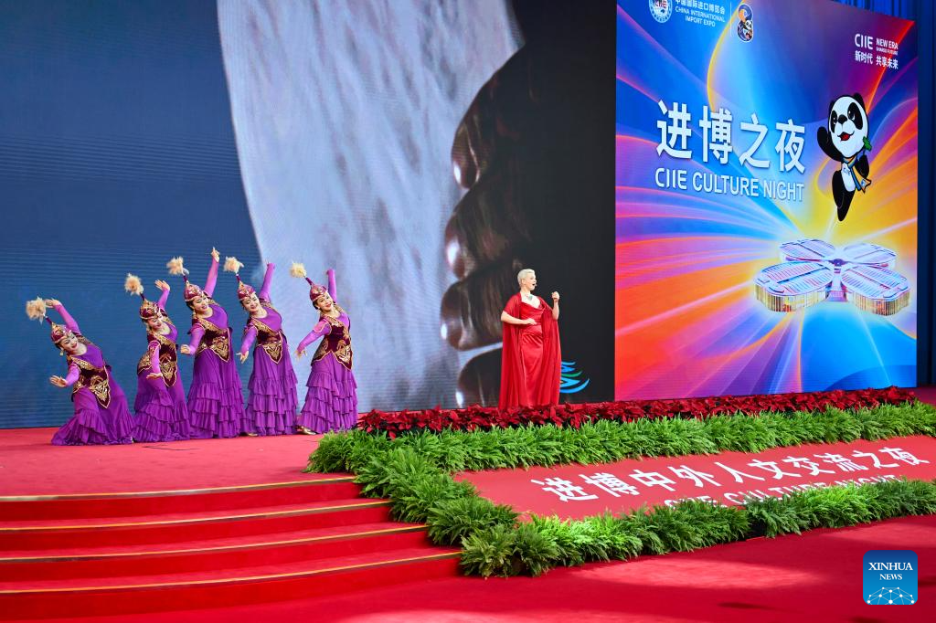 SHANGHAI, 6 noviembre, 2025 (Xinhua) -- Actrices realizan una presentación en el evento Noche de la Cultura de la Exposición Internacional de Importaciones de China (CIIE, por sus siglas en inglés) llevado a cabo al margen de la VIII CIIE en el Centro Nacional de Exposiciones y Convenciones (Shanghai), en Shanghai, en el este de China, el 6 de noviembre de 2025. (Xinhua/Chen Haoming)