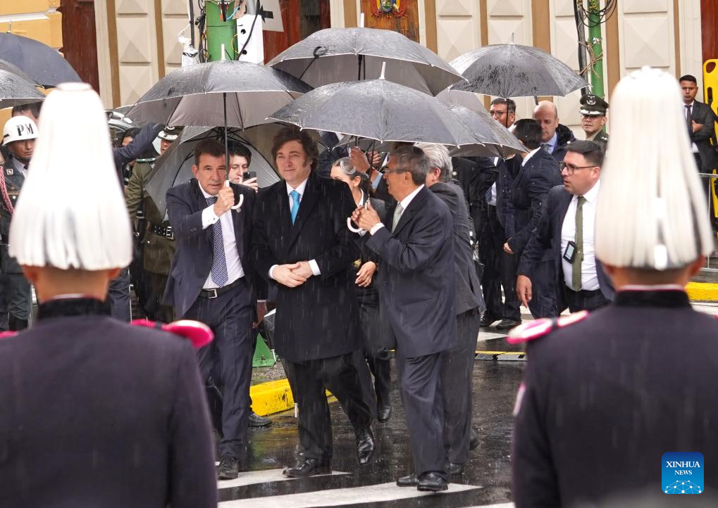 El presidente argentino, Javier Milei (c), llega a la ceremonia de juramentación del presidente electo boliviano, Rodrigo Paz, en la Asamblea Legislativa Plurinacional, en la ciudad de La Paz, Bolivia, el 8 de noviembre de 2025. Rodrigo Paz juró el sábado como nuevo presidente de Bolivia para el período 2025-2030, con un discurso en el que aseguró que su gestión no estará orientada al control del poder, sino al servicio público. (Xinhua/Javier Mamani)