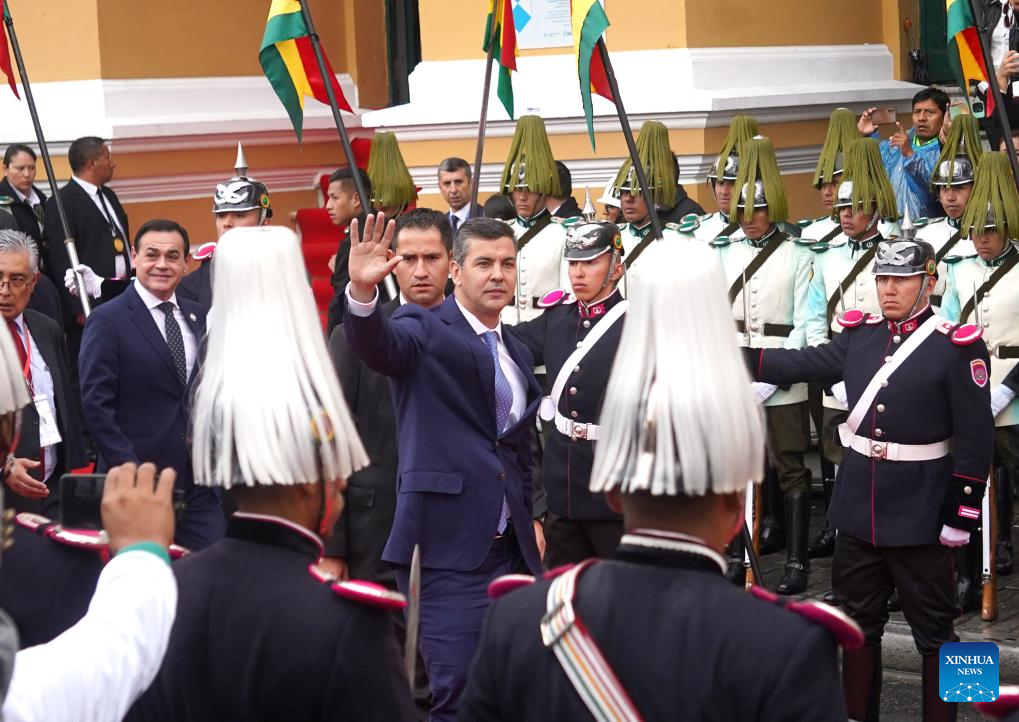 El presidente paraguayo, Santiago Peña (c), saluda a su salida de la Asamblea Legislativa Plurinacional al término de la ceremonia de juramentación del presidente boliviano, Rodrigo Paz, en la ciudad de La Paz, Bolivia, el 8 de noviembre de 2025. Rodrigo Paz juró el sábado como nuevo presidente de Bolivia para el período 2025-2030, con un discurso en el que aseguró que su gestión no estará orientada al control del poder, sino al servicio público. (Xinhua/Javier Mamani)