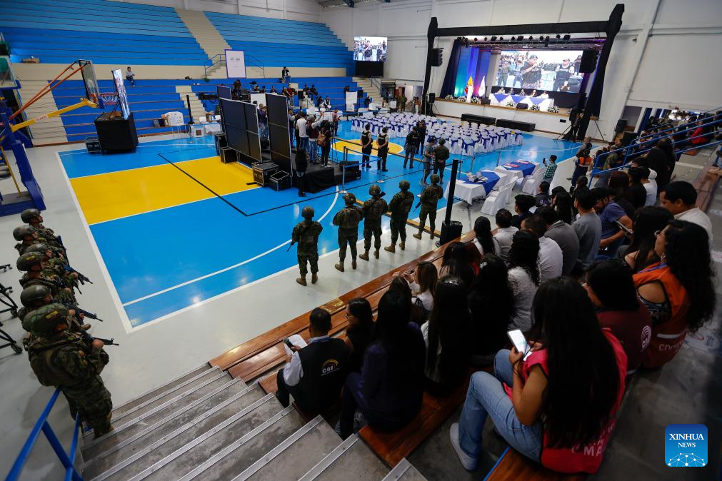 QUITO, 9 noviembre, 2025 (Xinhua) -- Elementos de las Fuerzas Armadas vigilan durante el Simulacro Nacional de la Consulta Popular y Referendo 2025, organizado por el Consejo Nacional Electoral (CNE) en el auditorio de la Universidad Politécnica Salesiana, en la ciudad Quito, en la capital de Ecuador, el 9 de noviembre de 2025. El CNE de Ecuador realizó el domingo un simulacro a nivel nacional de la consulta popular y el referendo constitucional convocados por el Gobierno para el próximo 16 de noviembre, informó la presidenta del organismo, Diana Atamaint. (Xinhua/Ricardo Landeta)