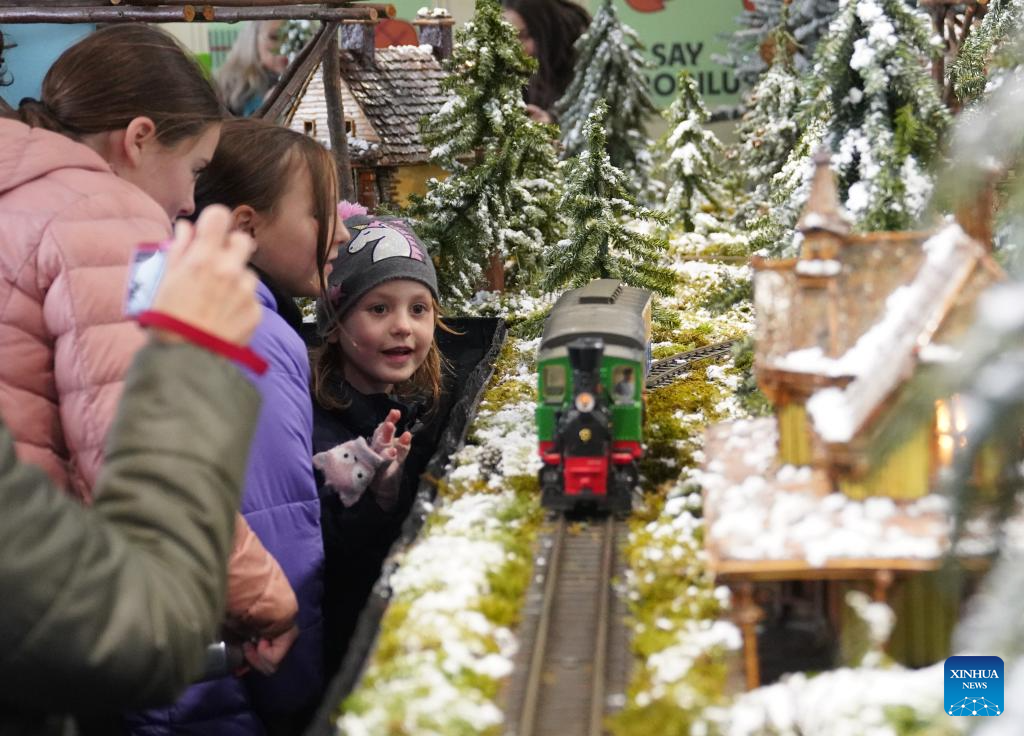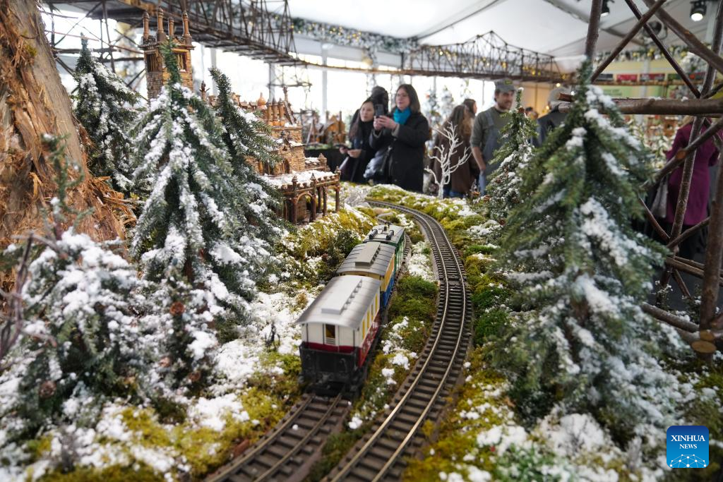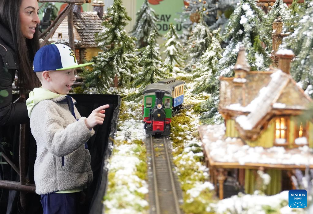 NUEVA YORK, 12 noviembre, 2025 (Xinhua) -- Imagen del 11 de noviembre de 2025 de visitantes observando un tren a escala durante la vista previa de la Exposición de Trenes Navideños, en el Jardín Botánico de Nueva York, en Nueva York, Estados Unidos. Una vista previa de la Exposición de Trenes Navideños se llevó a cabo el martes presentando maquetas de trenes a escala que circulan por una Ciudad de Nueva York en miniatura. (Xinhua/Zhang Fengguo)