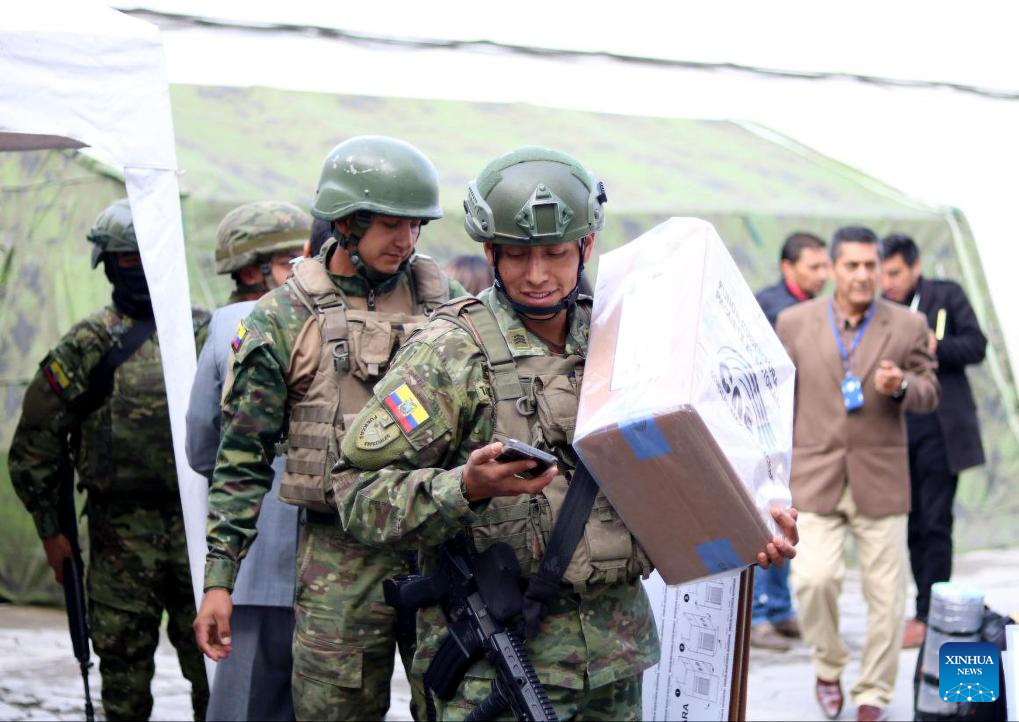 CARCHI, 13 noviembre, 2025 (Xinhua) -- Imagen proveída por el Consejo Nacional Electoral (CNE) de un soldado cargando material electoral en un Centro de Privación de Libertad, en la ciudad de Tulcán, en la la provincia de Carchi, Ecuador, el 13 de noviembre de 2025. Un total de 8.642 presos sin sentencia condenatoria ejecutoriada en Ecuador ejercen el jueves de manera anticipada su derecho al voto en la consulta popular y el referendo constitucional que impulsa el Gobierno, previo al resto de los electores que lo hará el próximo domingo 16 de noviembre, informó el CNE. (Xinhua/CNE)