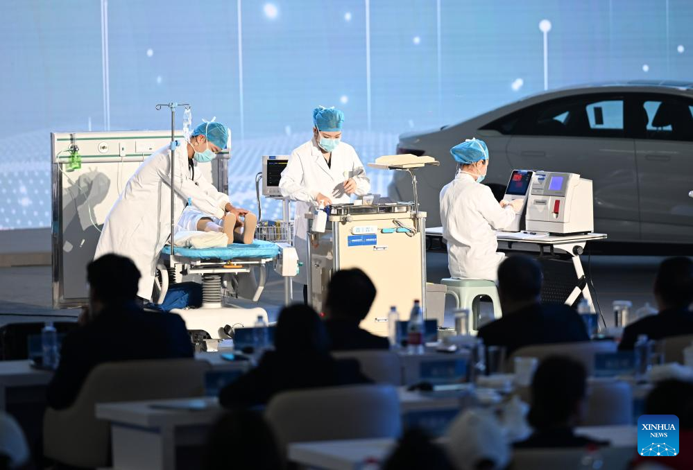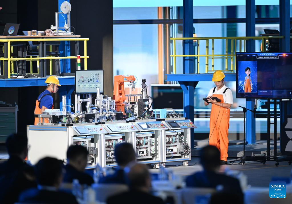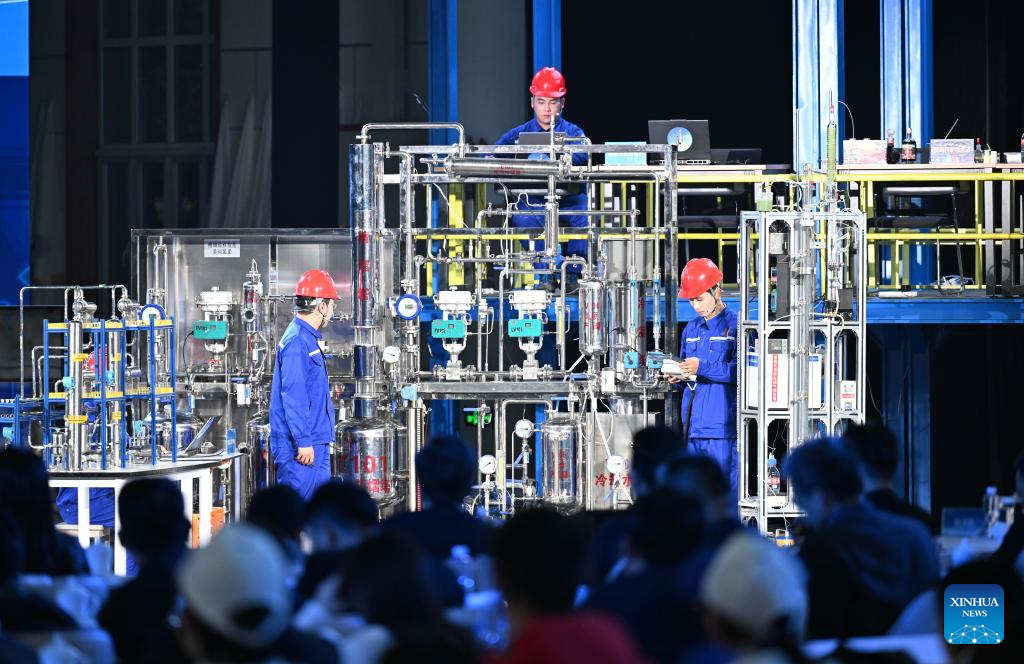 TIANJIN, 14 noviembre, 2025 (Xinhua) -- Concursantes de la Universidad de Tecnología Vocacional de Jinhua compiten durante la Competencia Mundial de Habilidades de Colegios Vocacionales 2025, en Tianjin, en el norte de China, el 14 de noviembre de 2025. Seis equipos participaron aquí el viernes en la final de esta competencia y la Universidad de Tecnología Vocacional de Jinhua obtuvo el campeonato. (Xinhua/Zhao Zishuo)