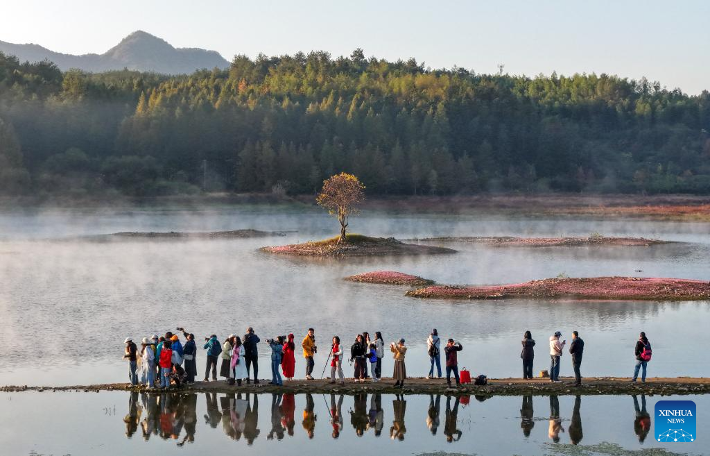 HUANGSHAN, 14 noviembre, 2025 (Xinhua) -- Imagen tomada con dron de turistas disfrutando del paisaje del lago Qishu, en el distrito de Yixian, en la provincia de Anhui, en el este de China, el 14 de noviembre de 2025. (Xinhua/Shi Yalei)