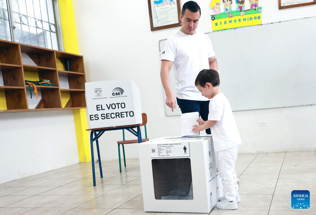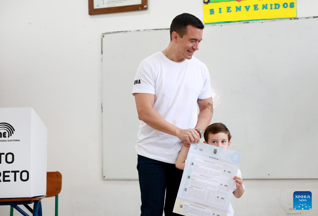 SANTA ELENA, 16 noviembre, 2025 (Xinhua) -- Imagen proveída por la Presidencia de Ecuador del presidente ecuatoriano, Daniel Noboa (atrás) y su hijo, depositando su voto en una urna en un centro electoral durante la jornada electoral, en Olón, en la provincia de Santa Elena, Ecuador, el 16 de noviembre de 2025. Los colegios electorales en Ecuador abrieron el domingo a las 07:00 hora local (12:00 GMT) para las votaciones de la consulta popular y referendo constitucional impulsados por el Gobierno sobre temas políticos y de seguridad nacional. (Xinhua/Isaac Castillo/Presidencia de Ecuador)
