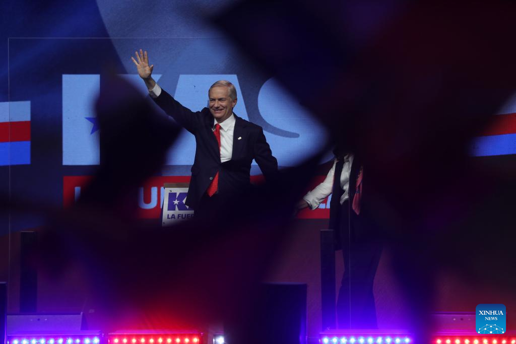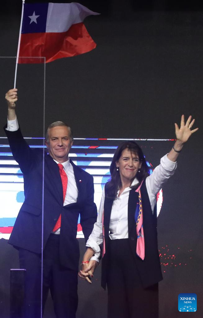 Imagen del 16 de noviembre de 2025 del candidato a la Presidencia chilena, líder de la ultraderecha local, José Antonio Kast (i), saludando luego de la primera vuelta de las elecciones presidenciales, en la ciudad de Santiago, capital de Chile. La candidata izquierdista Jeannette Jara y el ultraderechista José Antonio Kast disputarán el balotaje por la presidencia de Chile el 14 de diciembre próximo, tras obtener las primeras preferencias en las elecciones generales del domingo. (Xinhua/Str)