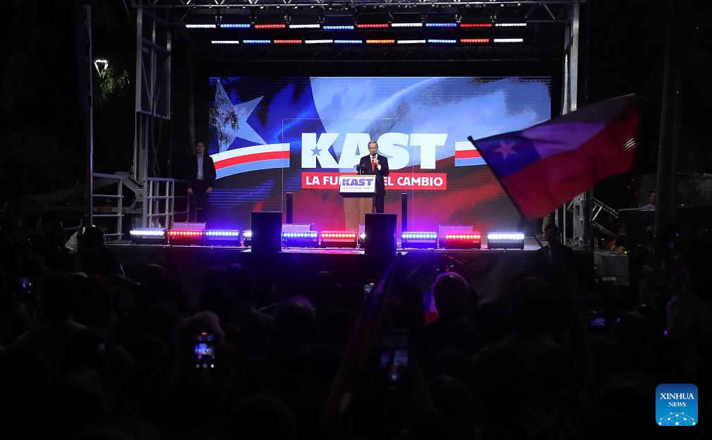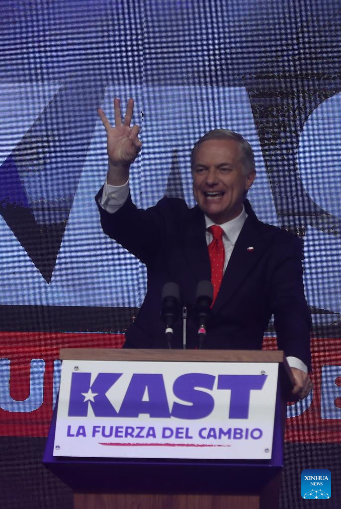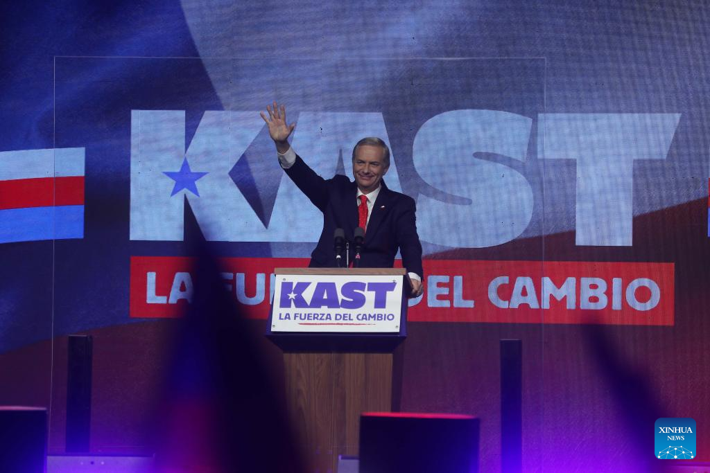 Imagen del 16 de noviembre de 2025 del candidato a la Presidencia chilena, líder de la ultraderecha local, José Antonio Kast, pronunciando un discurso luego de la primera vuelta de las elecciones presidenciales, en la ciudad de Santiago, capital de Chile. La candidata izquierdista Jeannette Jara y el ultraderechista José Antonio Kast disputarán el balotaje por la presidencia de Chile el 14 de diciembre próximo, tras obtener las primeras preferencias en las elecciones generales del domingo. (Xinhua/Str)
