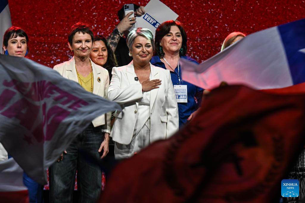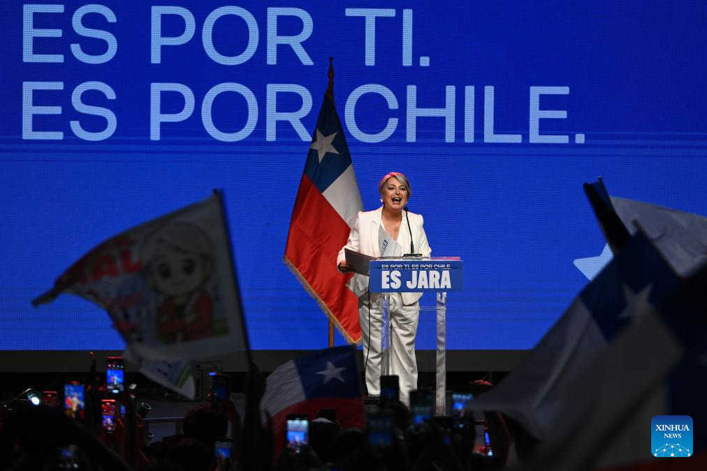 Imagen del 16 de noviembre de 2025 de la candidata a la Presidencia chilena, abanderada de la izquierda y el oficialismo, Jeannette Jara (c), pronunciando un discurso luego de la primera vuelta de las elecciones presidenciales, en la ciudad de Santiago, capital de Chile. La candidata izquierdista Jeannette Jara y el ultraderechista José Antonio Kast disputarán el balotaje por la presidencia de Chile el 14 de diciembre próximo, tras obtener las primeras preferencias en las elecciones generales del domingo. (Xinhua/Jorge VIllegas)