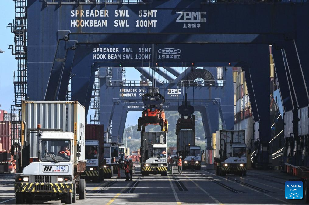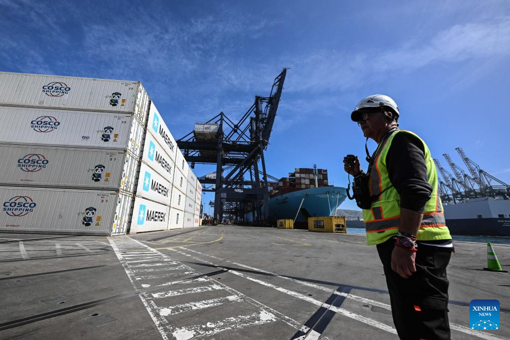 SAN ANTONIO, 19 noviembre, 2025 (Xinhua) -- Imagen del 18 de noviembre de 2025 de un trabajador portuario laborando frente a un buque cargado con contenedores durante la ceremonia de lanzamiento de la temporada de exportación de cerezas 2025-2026 en las dependencias de San Antonio Terminal Internacional, en el puerto de San Antonio, en la región de Valparaíso, Chile. Chile comenzó esta semana la temporada de exportación de cerezas frescas 2025-2026 por vía marítima, con barcos de ruta directa hacia China para abastecer al mercado asiático en su temporada invernal. (Xinhua/Jorge Villegas)