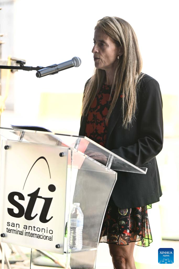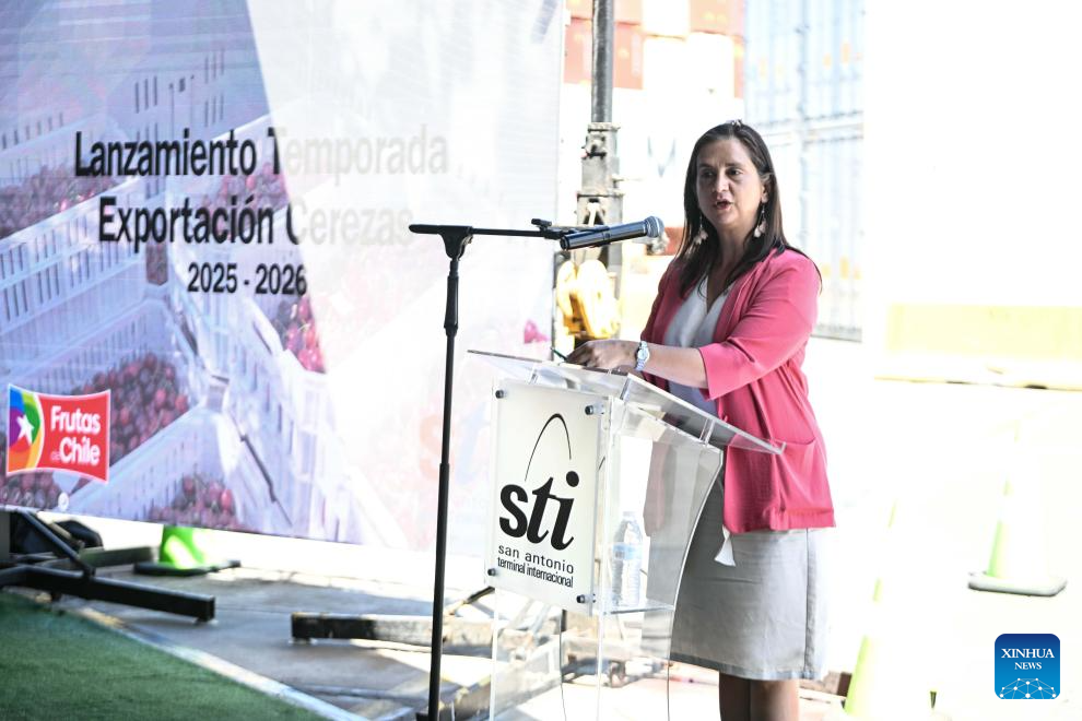 SAN ANTONIO, 19 noviembre, 2025 (Xinhua) -- Imagen del 18 de noviembre de 2025 de la directora ejecutiva del Comité de Cerezas de Frutas de Chile, Claudia Soler, pronunciando un discurso durante la ceremonia de lanzamiento de la temporada de exportación de cerezas 2025-2026 en las dependencias de San Antonio Terminal Internacional, en el puerto de San Antonio, en la región de Valparaíso, Chile. Chile comenzó esta semana la temporada de exportación de cerezas frescas 2025-2026 por vía marítima, con barcos de ruta directa hacia China para abastecer al mercado asiático en su temporada invernal. (Xinhua/Jorge Villegas)