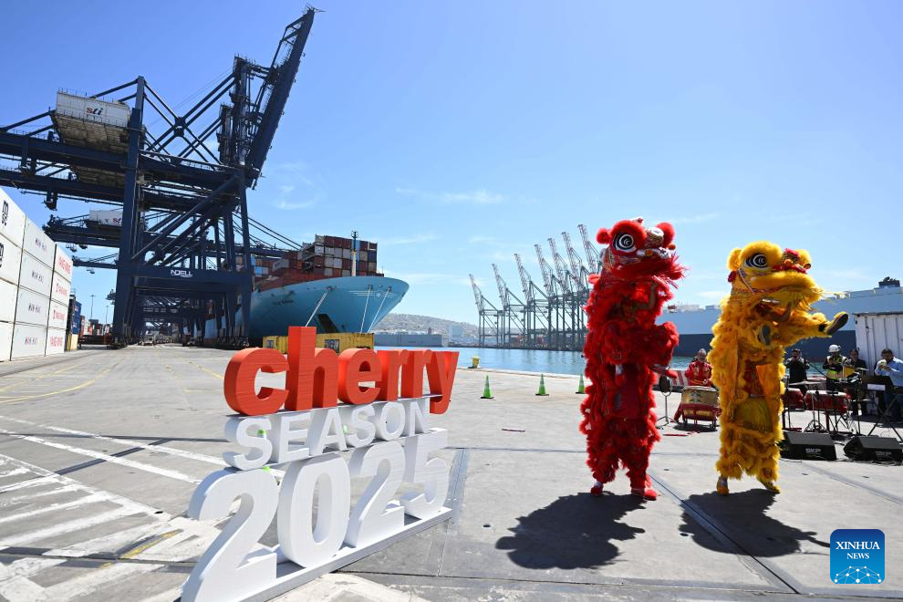SAN ANTONIO, 19 noviembre, 2025 (Xinhua) -- Imagen del 18 de noviembre de 2025 de artistas realizando una presentación de la danza del león durante la ceremonia de lanzamiento de la temporada de exportación de cerezas 2025-2026 en las dependencias de San Antonio Terminal Internacional, en el puerto de San Antonio, en la región de Valparaíso, Chile. Chile comenzó esta semana la temporada de exportación de cerezas frescas 2025-2026 por vía marítima, con barcos de ruta directa hacia China para abastecer al mercado asiático en su temporada invernal. (Xinhua/Jorge Villegas)