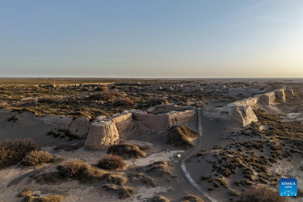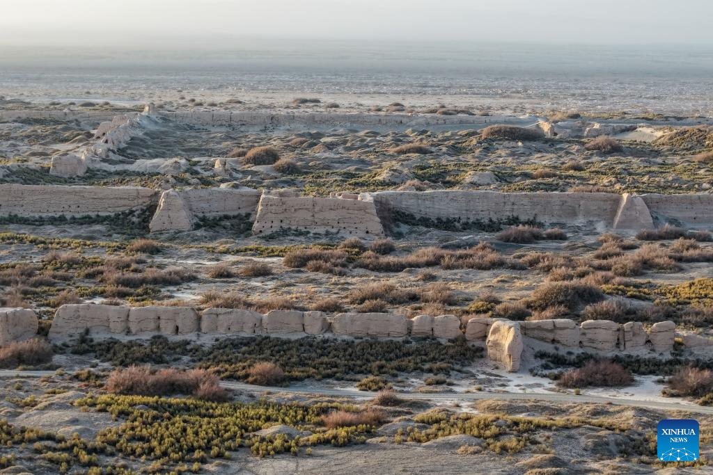 GUAZHOU, 19 noviembre, 2025 (Xinhua) -- Imagen tomada con un dron el 18 de noviembre de 2025 del templo Ta'er en las ruinas de la ciudad de Suoyang, en el distrito de Guazhou, en la ciudad de Jiuquan, en la provincia de Gansu, en el noroeste de China. Ubicadas en el desierto de Gobi, en el sureste de la actual ciudad de Suoyang, las ruinas de la ciudad de Suoyang, que antiguamente desempeñaba un papel fundamental en la defensa fronteriza y el transporte, comprenden el sitio de la ciudad de Suoyang, el templo Ta'er, los restos de un sistema de canales de riego y un conjunto de tumbas. (Xinhua/Lang Bingbing)