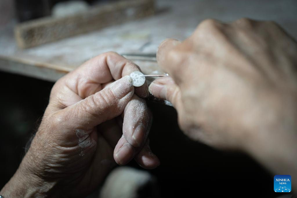 BUENOS AIRES, 19 noviembre, 2025 (Xinhua) -- El maestro botonero, Eduardo Alonso, realiza un grabado artístico en un botón en su establecimiento "El rey de los botones", en la ciudad de Buenos Aires, Argentina, el 19 de noviembre de 2025. Un hombre de 86 años que reside en la capital de Argentina, Buenos Aires, mantiene vivo el oficio de hacer botones, una verdadera pasión artesanal por la que es reconocido a diario por vecinos e incluso turistas, que se acercan a conocer y admirar su esmerada labor en el populoso barrio de Flores. (Xinhua/Martín Zabala)